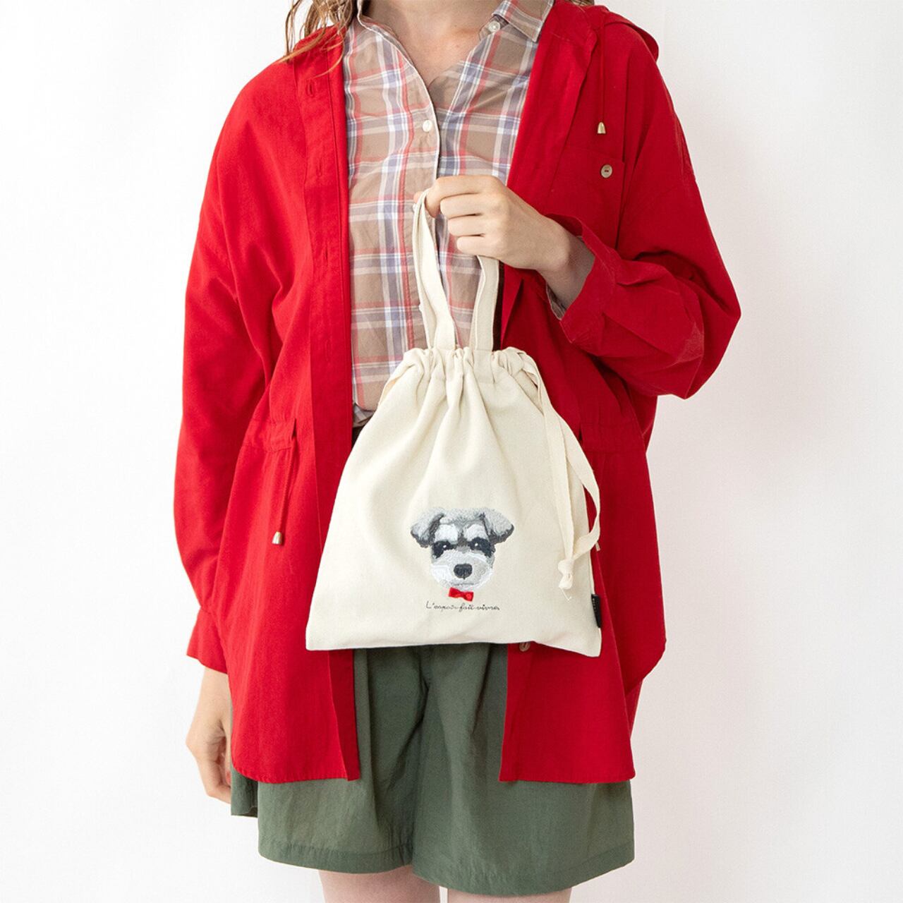 可愛い刺繍のアニマルにワンポイントで立体パーツがついたアトリエ・ポピンシリーズの巾着です。 トートバッグのように使用したり、旅行時の収納バッグとしても◎ 【サイズ・容量】 H320×W285(mm) 【素材・成分】 帆布 【生産地】 中国