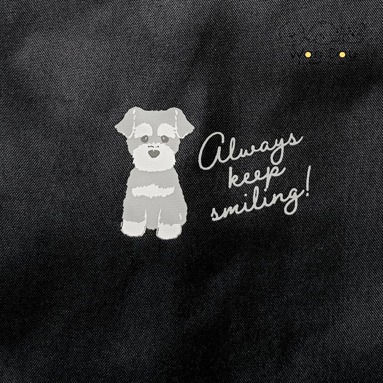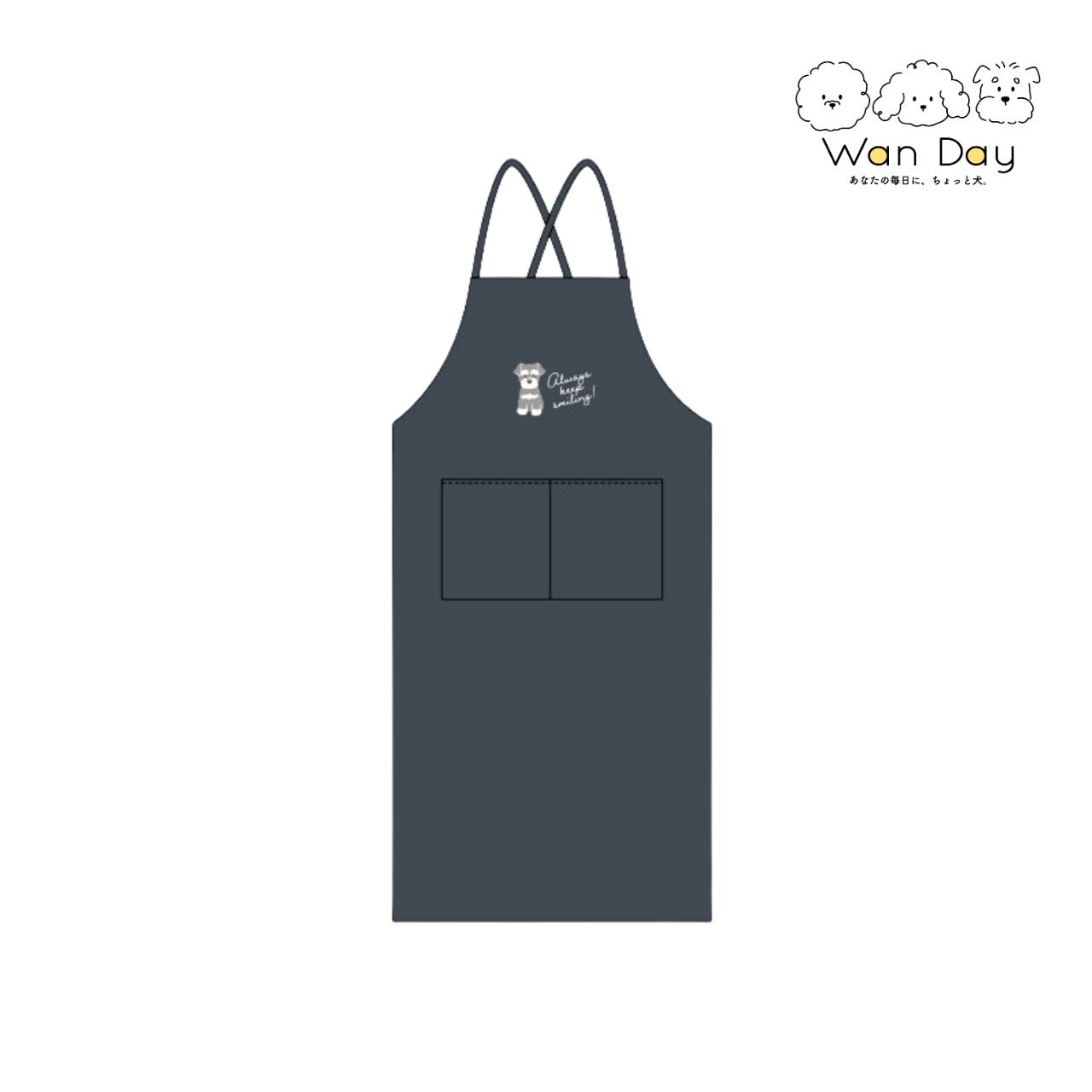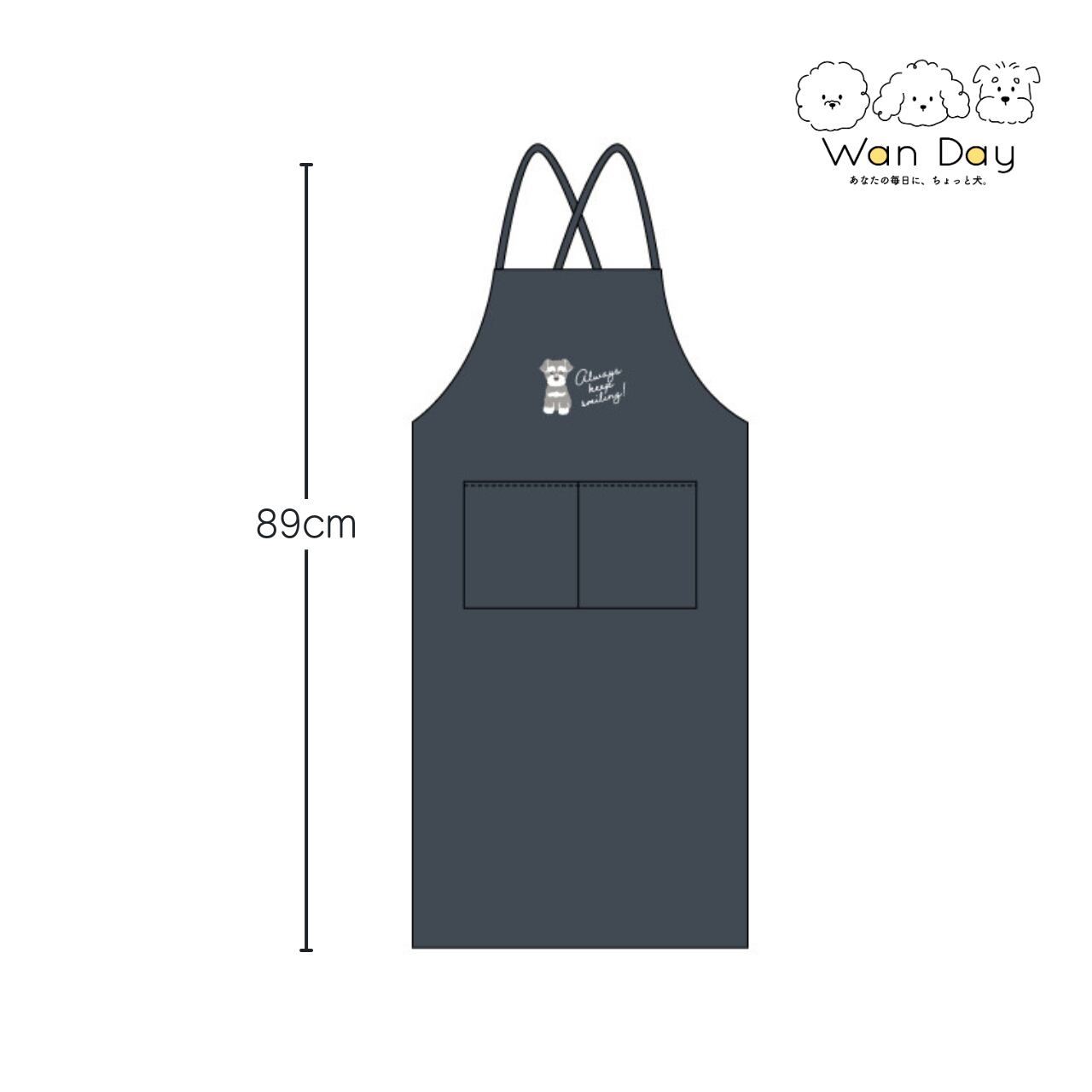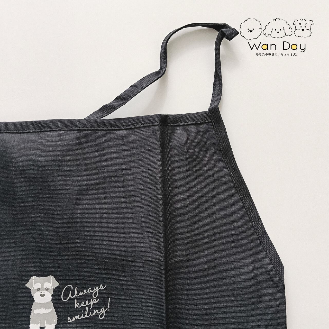 胸元にシュナウザーのプリントデザインが入っているエプロンです。 【サイズ】 W67×H89cm 【素材・成分】 ポリエステル100% 【生産地】 中国